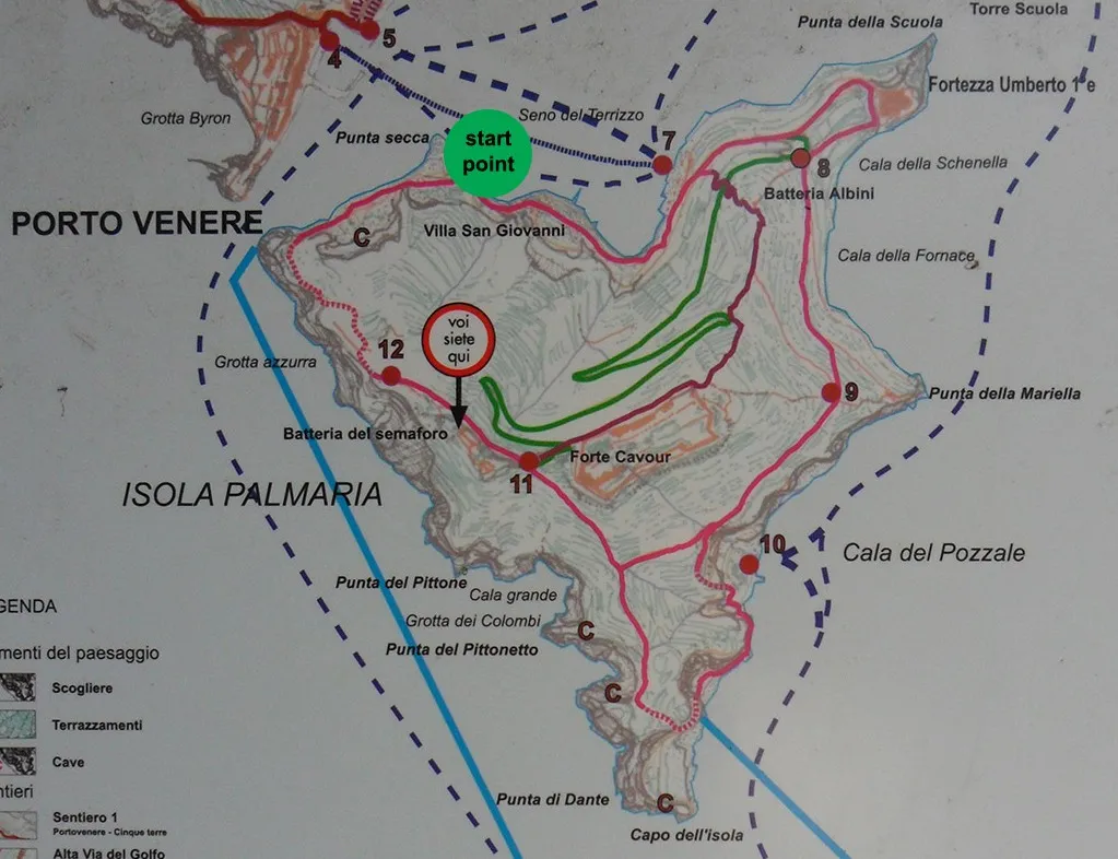 Palmaria Island is located not far from Porto Venere. The tourist boats sail here from the town port. A green circle indicates the place of their arrival on island i.e. the starting point of all walking trails. And here you find a lot of trails, because, in addition to the important ones, there are many others.